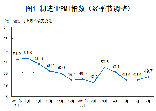 2019年7月份,中国制造业采购经理指数(PMI)为49.7%,比上月提高0.3个百分点,制造业景气水平有所回升。