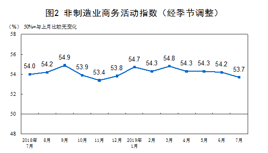 2019年7月份,中国非制造业商务活动指数为53.7%,比上月回落0.5个百分点,位于扩张区间。