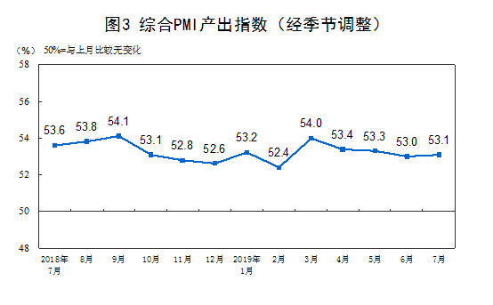 2019年7月份,综合PMI产出指数为53.1%,比上月微升0.1个百分点,表明我国企业生产经营活动稳步扩张。
